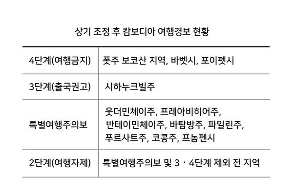 이번에 새롭게 여행금지 지역으로 지정된 곳은 캄폿주 보코산 지역, 바벳시, 포이펫시 등 3곳이다. 또한 시하누크빌주는 3단계(출국권고)로 상향 조정되며, 기존 특별여행주의보가 발령된 지역의 효력은 그대로 유지된다. 현재 1단계(여행유의)로 분류된 지역은 2단계(여행자제)로 격상된다.