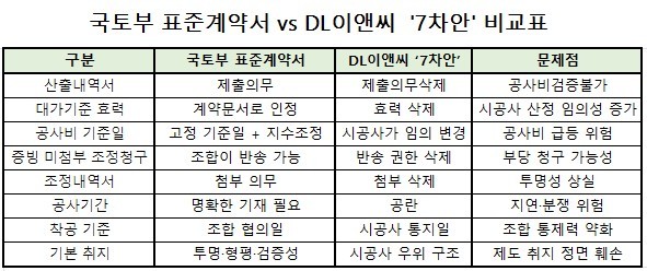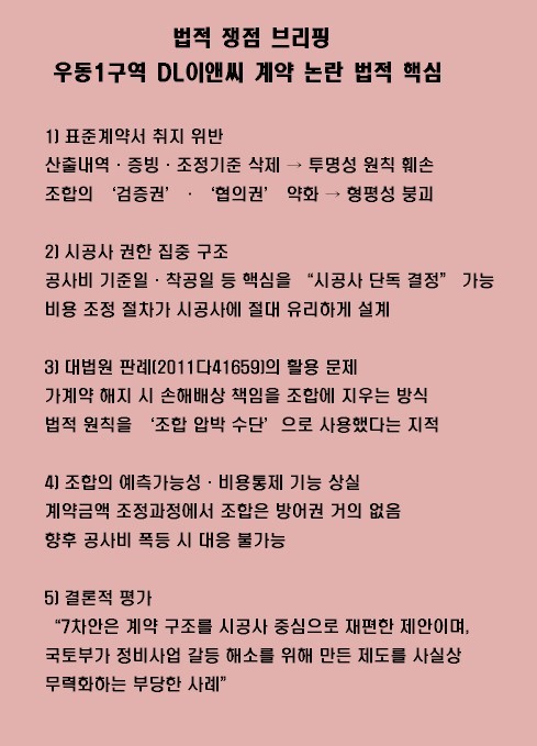 “DL이앤씨의 7차안은 공사비 증액 관련 핵심 권한을 시공사에게 과도하게 몰아준 구조다.표준계약서 제정 취지를 훼손하고 조합의 협상·검증권을 사실상 박탈하는 매우 부당한 조치로 보인다.”