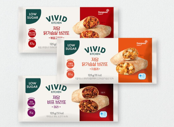 동원홈푸드는 ‘비비드키친 저당 브리또’ 3종(닭가슴살 치폴레·볶음고추장·비프 마라)을 출시했다. 알룰로스 기반 저당 소스와 통밀 토르티야, 컬리플라워 라이스를 사용해 저당·고단백·식이섬유를 모두 챙길 수 있다.